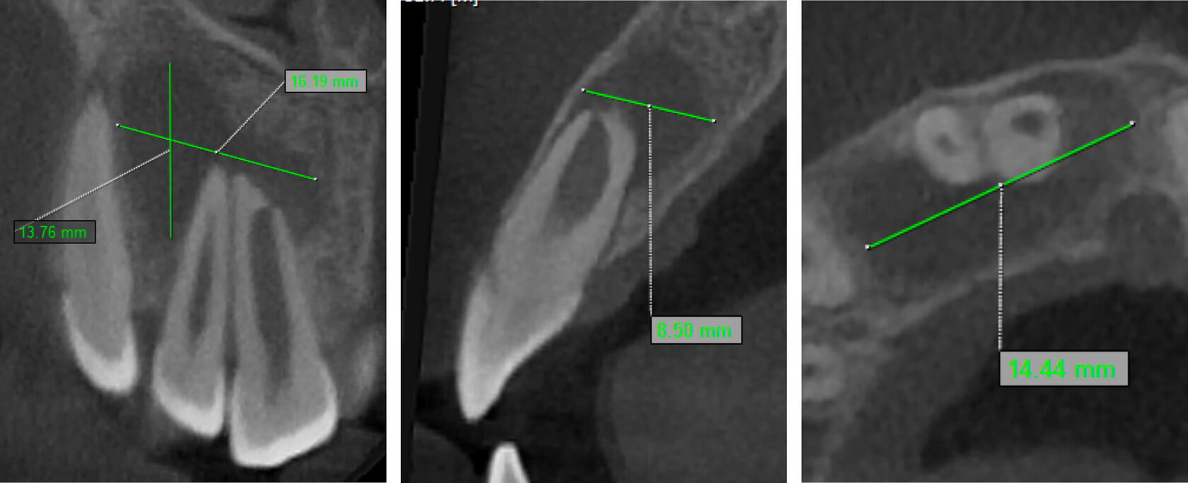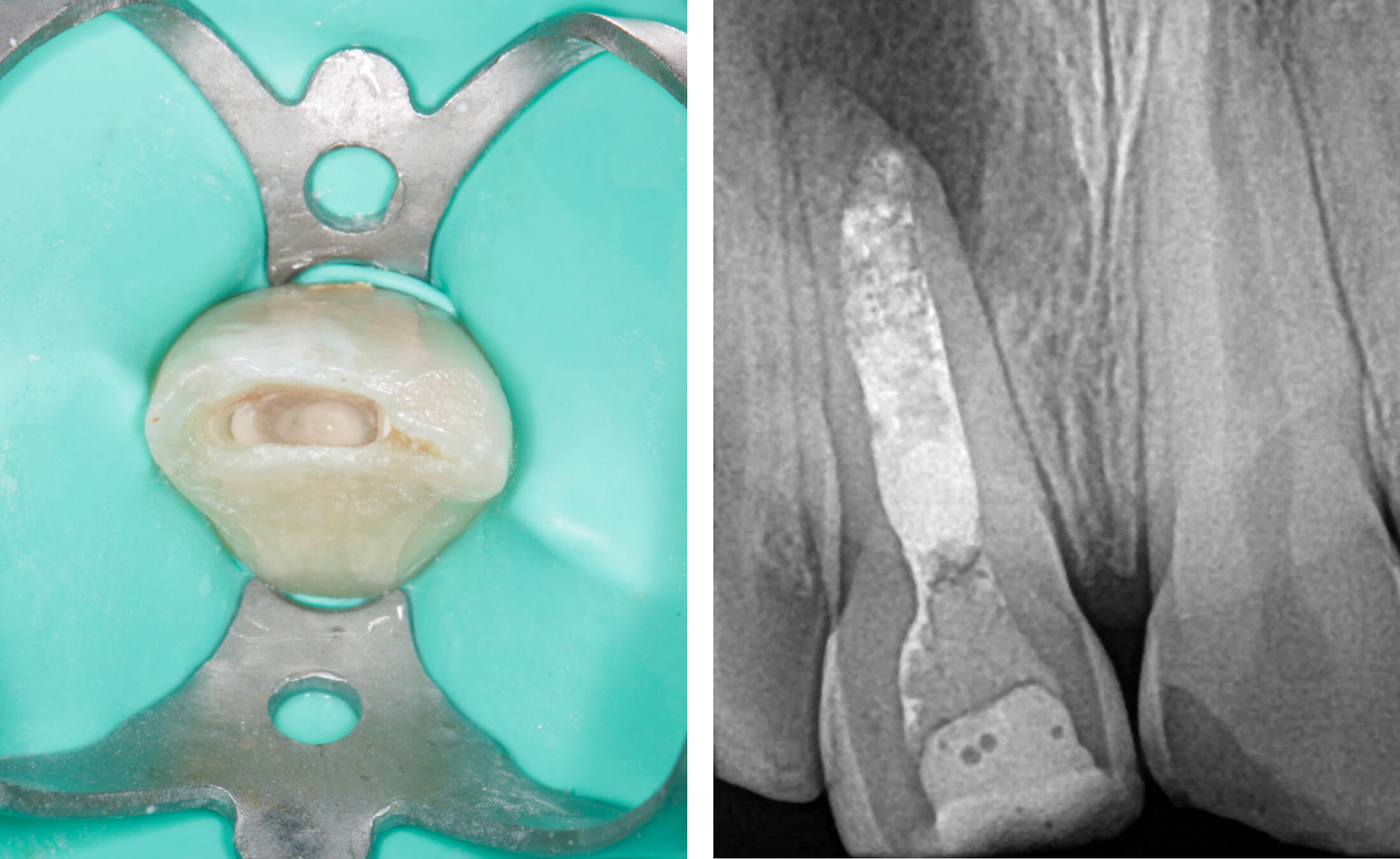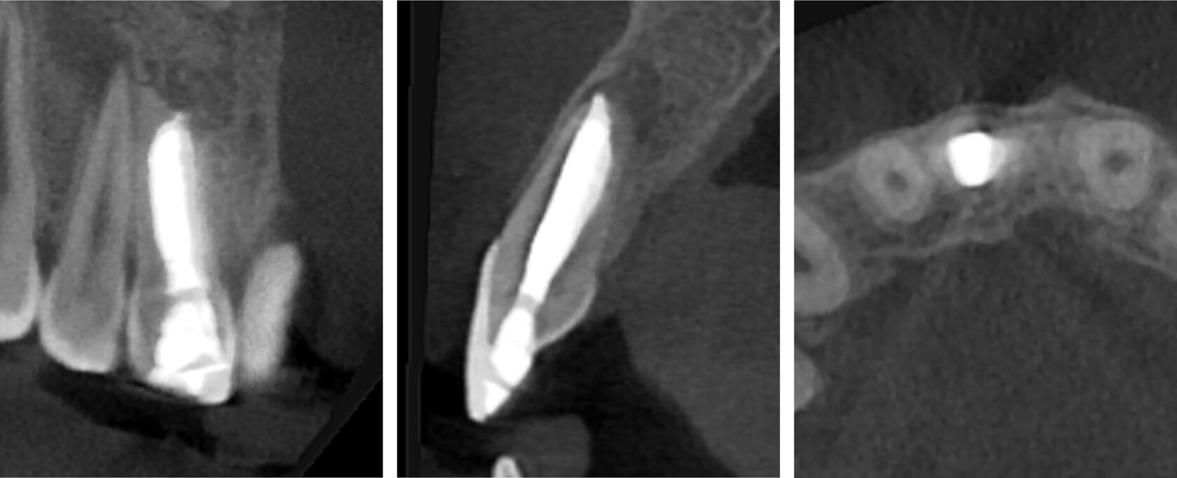 2. Tooth #11 was diagnosed as non-vital with apical periodontitis, presenting extensive periapical bone destruction radiographically. In contrast, tooth #12 responded normally to vitality tests, confirming pulp vitality. (Image 2,3,4)