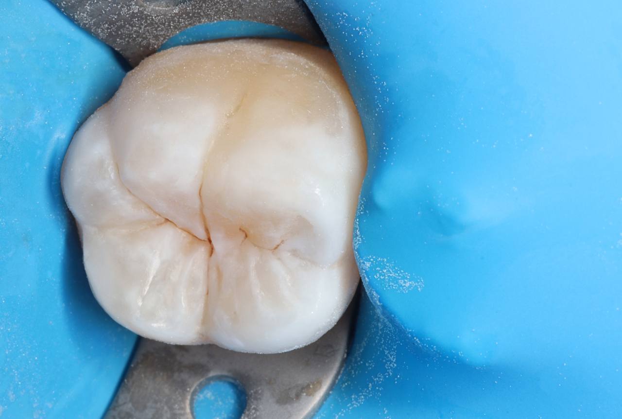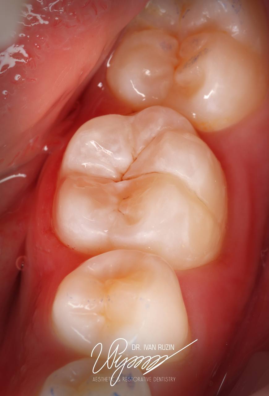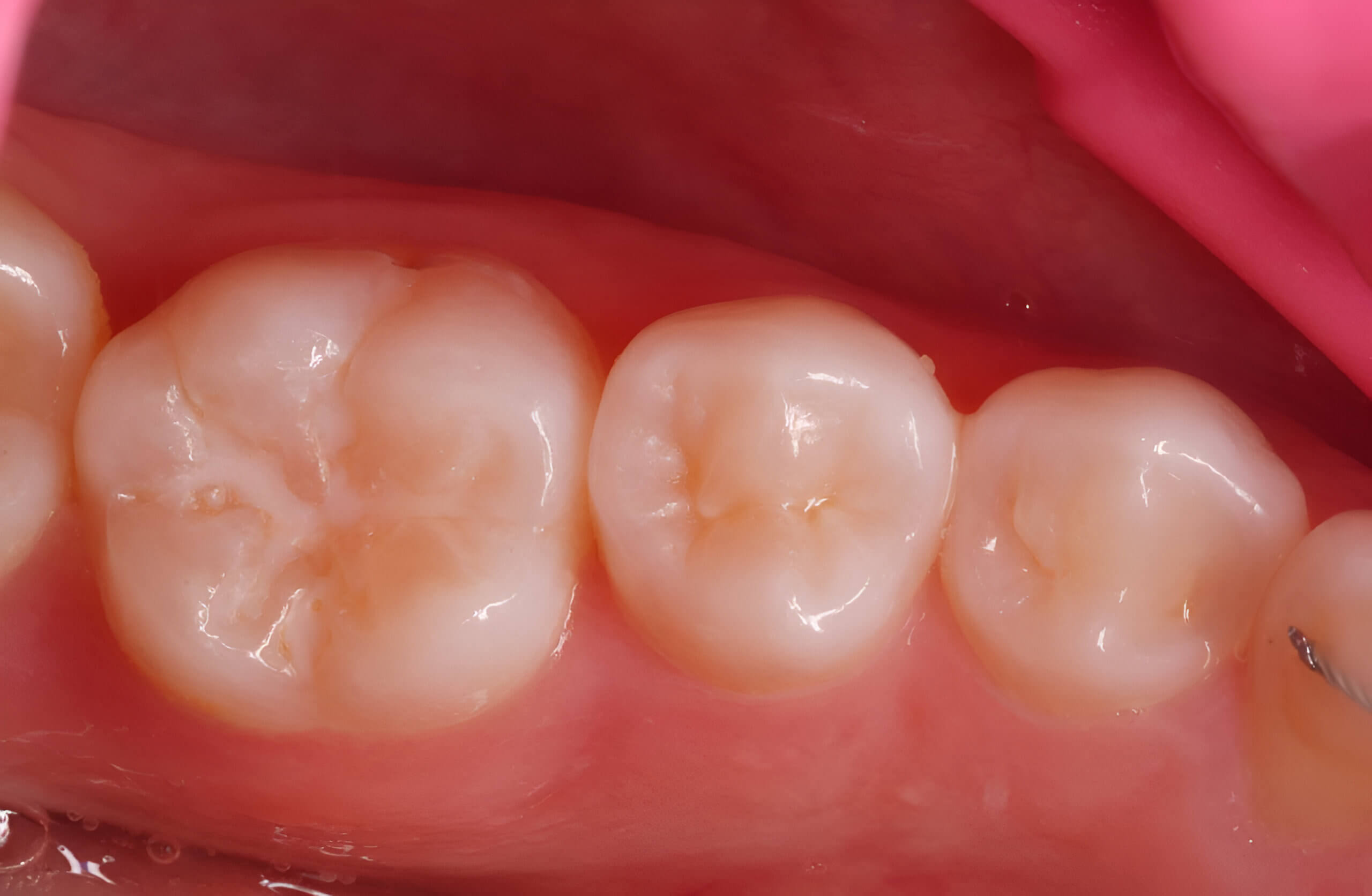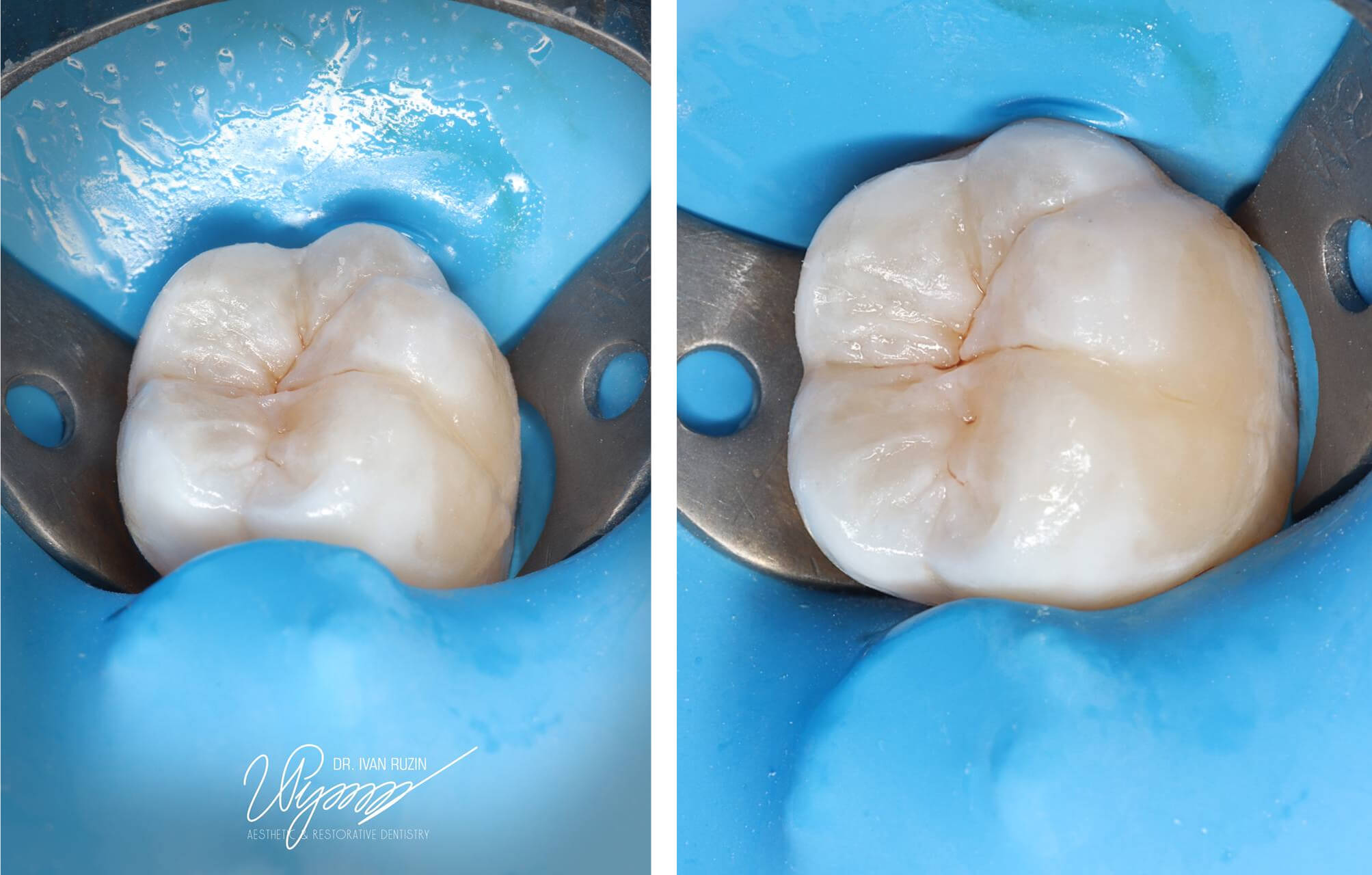 3. Post-operative view of the restoration after contouring. Stain application: BROWN by G-White in the fissure area to mimic pigmented fissures. (Images 3, 4)